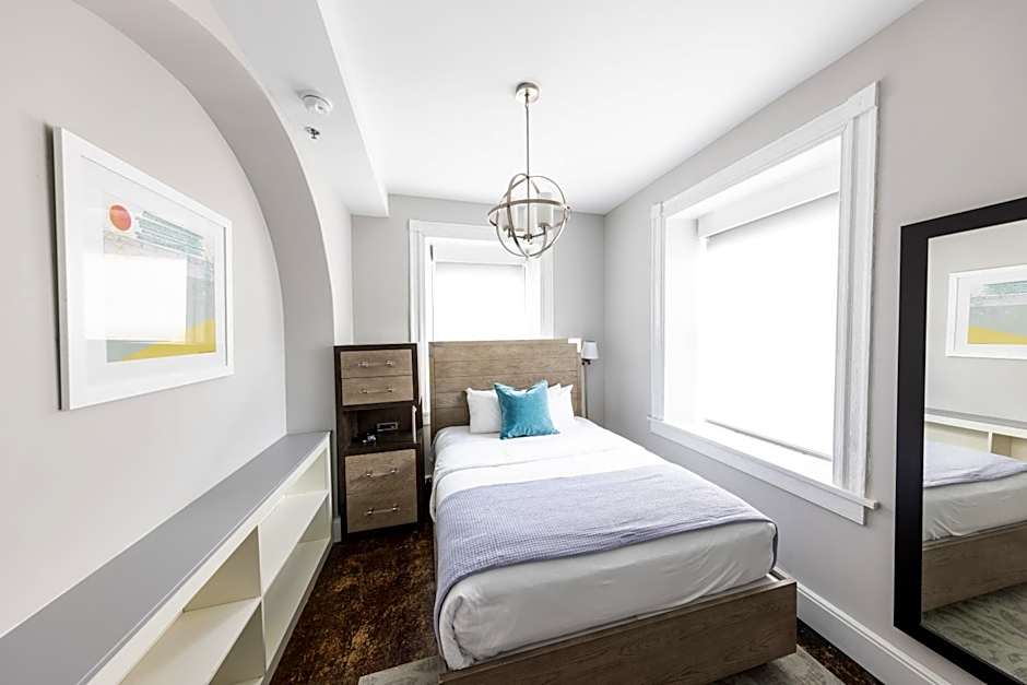 This single room features a queen bed, writing desk, and a bathroom, rain shower, a lighted vanity mirror and plush, bath sheets.